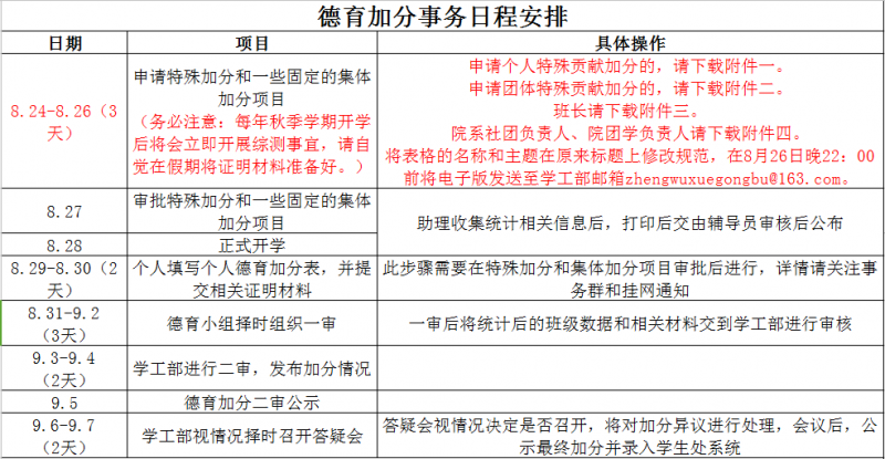 大家好,欢乐的暑假眨眼就过去了,新的一个学期即将来临,大家最为关注的奖学金评比也即将启动。为了推动奖学金评比工作的顺利进行,现将德育加分审核的日程安排公布如下: