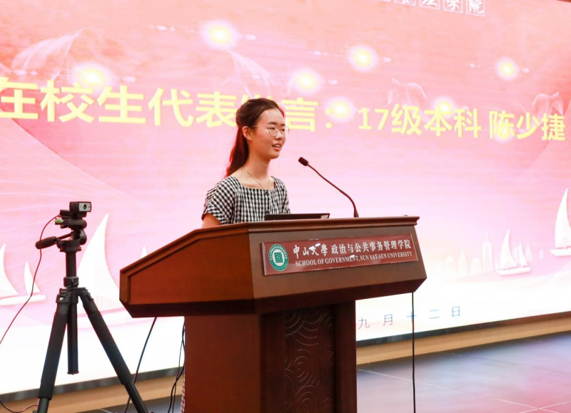 17级本科生陈少捷同学作为在校本科生代表,向各位新生分享了她学习生活经验。陈同学从学习、学生工作与社团、学习生活二者平衡三方面展开分享。少捷同学通过丰富的案例说明了大一时光的重要性,提醒各位新生进入大学后不能放松,要积极利用身边的学术资源,认真上好每一节课、阅读学术文献。同时,新生们需要尽快适应大学生活的独特节奏。对于学生工作与社团方面,陈同学以个人经验展现了参与学生工作的重要性,建议各位同学根据个人情况参加团学部门或社团,并在学习、学生工作与社团中寻找恰当的平衡。