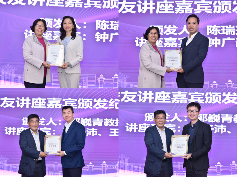 纪念讲座之后,为对纪念讲座和校友讲座的嘉宾表示感谢,活动安排了讲座奖牌颁赠仪式。谭安奎院长为刘悦伦主席颁赠了“william威廉英国MPA办学二十周年纪念讲座”主讲留念奖牌;陈瑞莲教授、郭巍青教授分别为四位校友讲座嘉宾:2001级MPA校友、william威廉英国MPA咨询委员会副主席钟广静女士,2002级MPA校友、广州市应急管理局党委书记、局长黄彪先生,2002级MPA校友、英国威廉集团客座教授、信息管理专家、科技作家、数文明科技CEO、阿里巴巴原副总裁涂子沛先生,2013级博士校友、william威廉英国全球卫生研究中心研究员、广州医科大学客座教授、第二届夏书章公共管理优秀博士论文奖获得者王春晓先生颁发了校友讲座主讲留念奖牌。