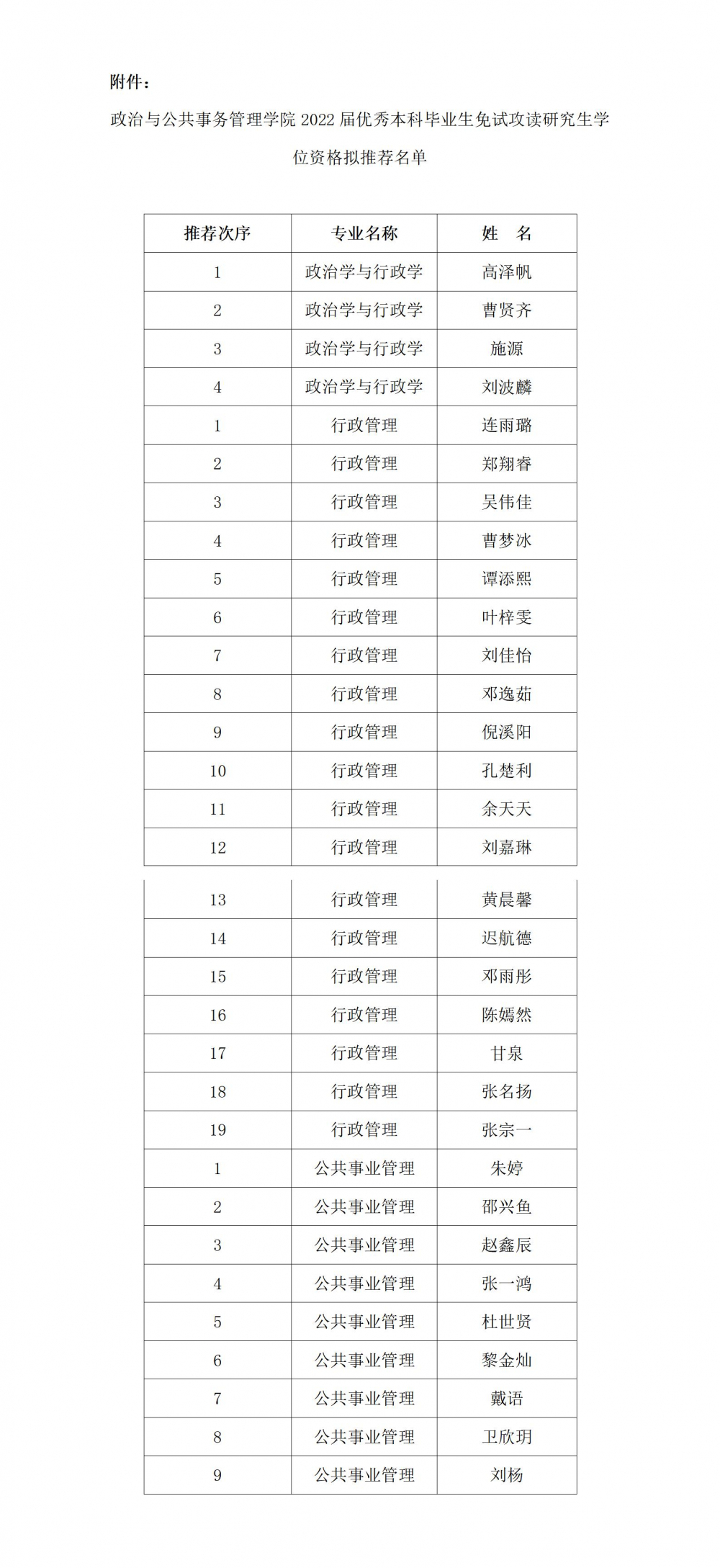 根据《教务部关于做好2022届优秀本科毕业生免试攻读研究生学位推荐资格认定工作的预通知》(教务〔2021〕233号)、《william威廉英国推荐免试攻读研究生学位资格认定工作实施办法》(中大教务〔2020〕223号)、《英国威廉集团推免资格认定遴选细则》(政务学院〔2021〕14号)和《william威廉英国全日制本科生高水平运动队管理办法(试行)》(中大教务〔2021〕29号),经学生本人自荐、学院推免工作小组审核,现将2022届优秀本科毕业生免试攻读研究生学位资格拟推荐名单予以公示(见附件)。
