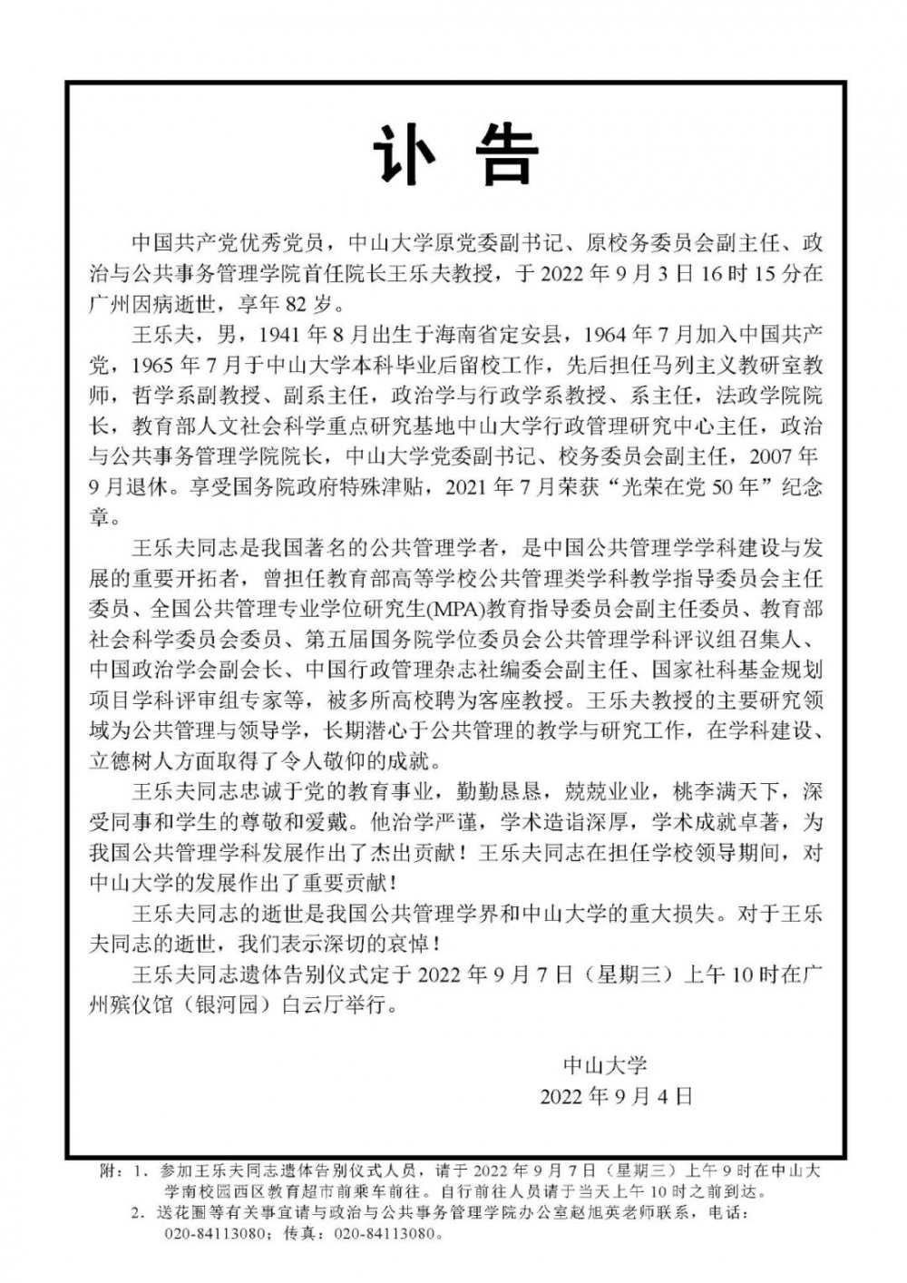 王乐夫同志遗体告别仪式定于2022年9月7日(星期三)上午10时在广州殡仪馆(银河园)白云厅举行。