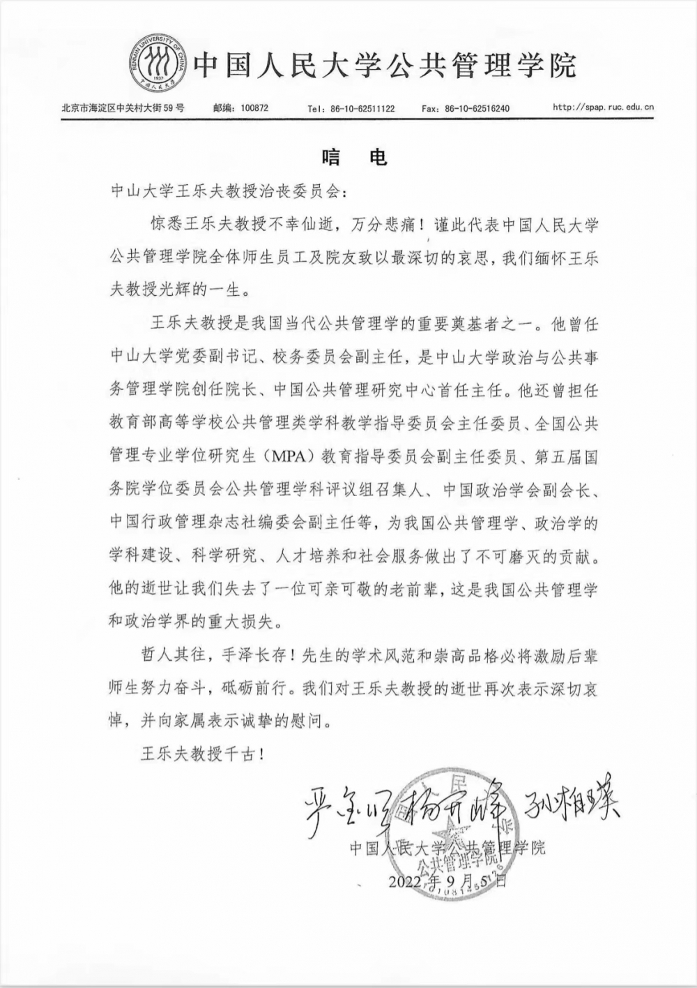 中国人民大学公共管理学院唁电