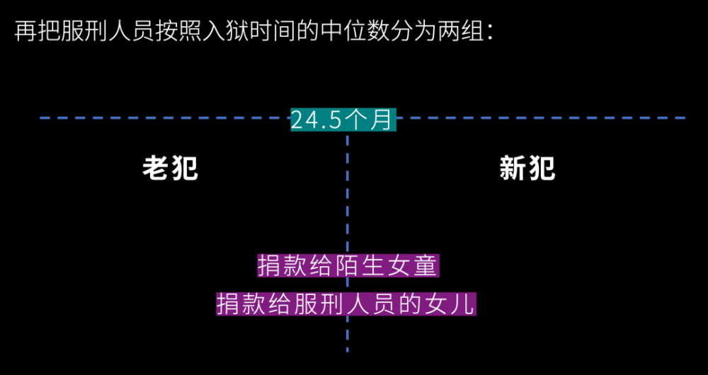 接下来第二个结果就更让我们惊讶了,我们想看看服刑时间对于帮助他人意愿的影响,于是我们按照入狱时间的中位数把犯人分成了两组,有一半犯人的入狱时间超过两年,还有一半低于两年。