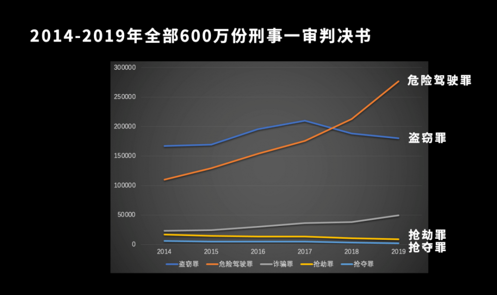 这是我们整理的在2014到2019年之间,全国600万份刑事一审判决书的情况。