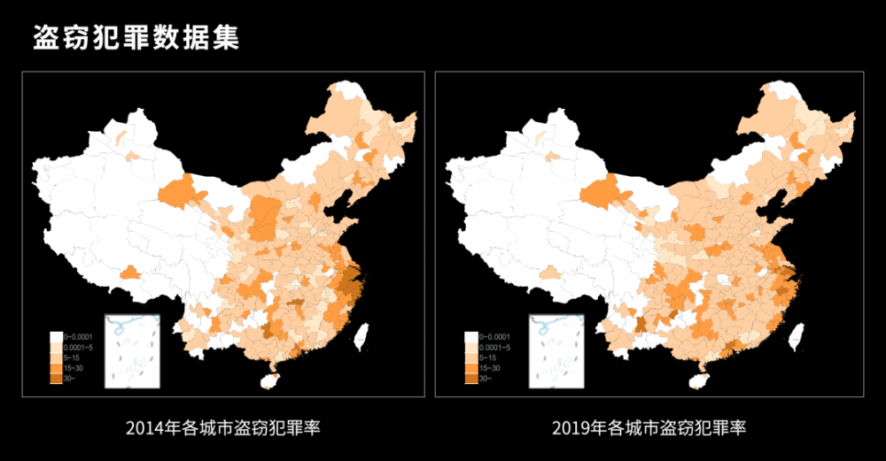 我们根据裁判文书整理的中国盗窃犯罪发案的情况,颜色深代表城市的盗窃犯罪率比较高。在沿海发达地区,总的来说盗窃犯罪率会相对更高,因为有钱的人比较多,容易被偷。
