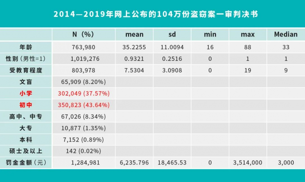 可以看到,他们的平均年龄是35岁,93%都是男性,从受教育程度来看,超过88%的盗窃犯都是初中以下文化程度,硕士以上的盗窃犯只有万分之二。