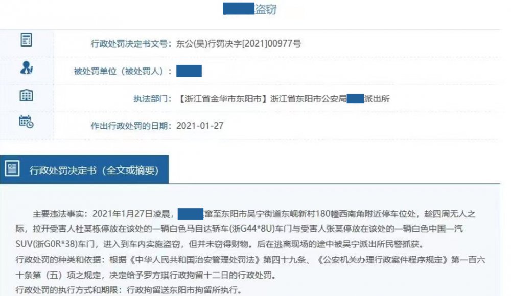 后面这位盗贼就更倒霉了,他两次拉开私家车车门试图实施盗窃,但是什么都没偷着,多次盗窃一无所获,行政拘留12日。