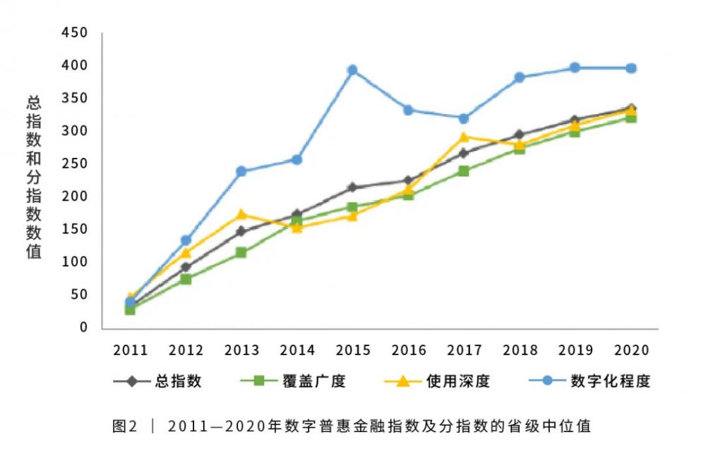 这是北京大学和蚂蚁集团研究院公布的数字普惠金融指数,蓝色的这条线叫数字化程度,来衡量移动支付的发展情况。