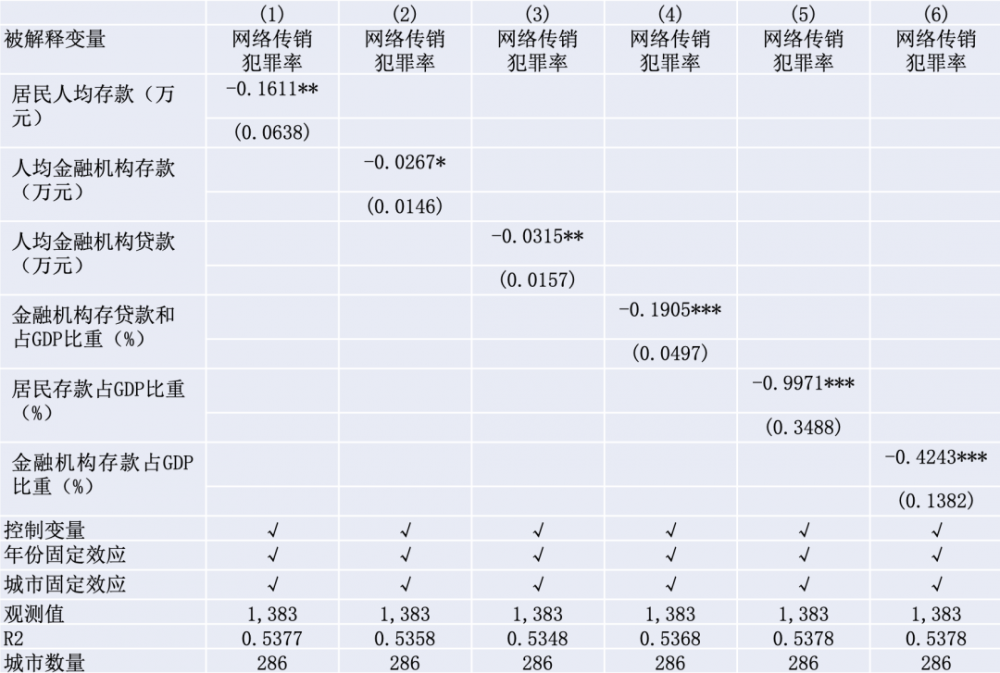 可以看到,不管是居民人均存款、人均金融机构存款、人均金融机构贷款,还是金融机构存贷款占GDP的比重,这些传统上衡量正规金融发展的指标,和网络传销的发案率都有着负向关系。