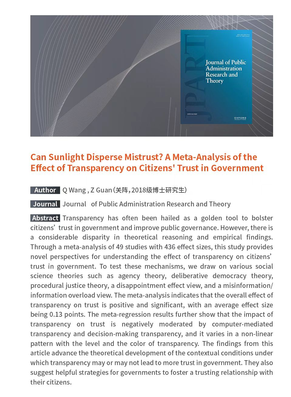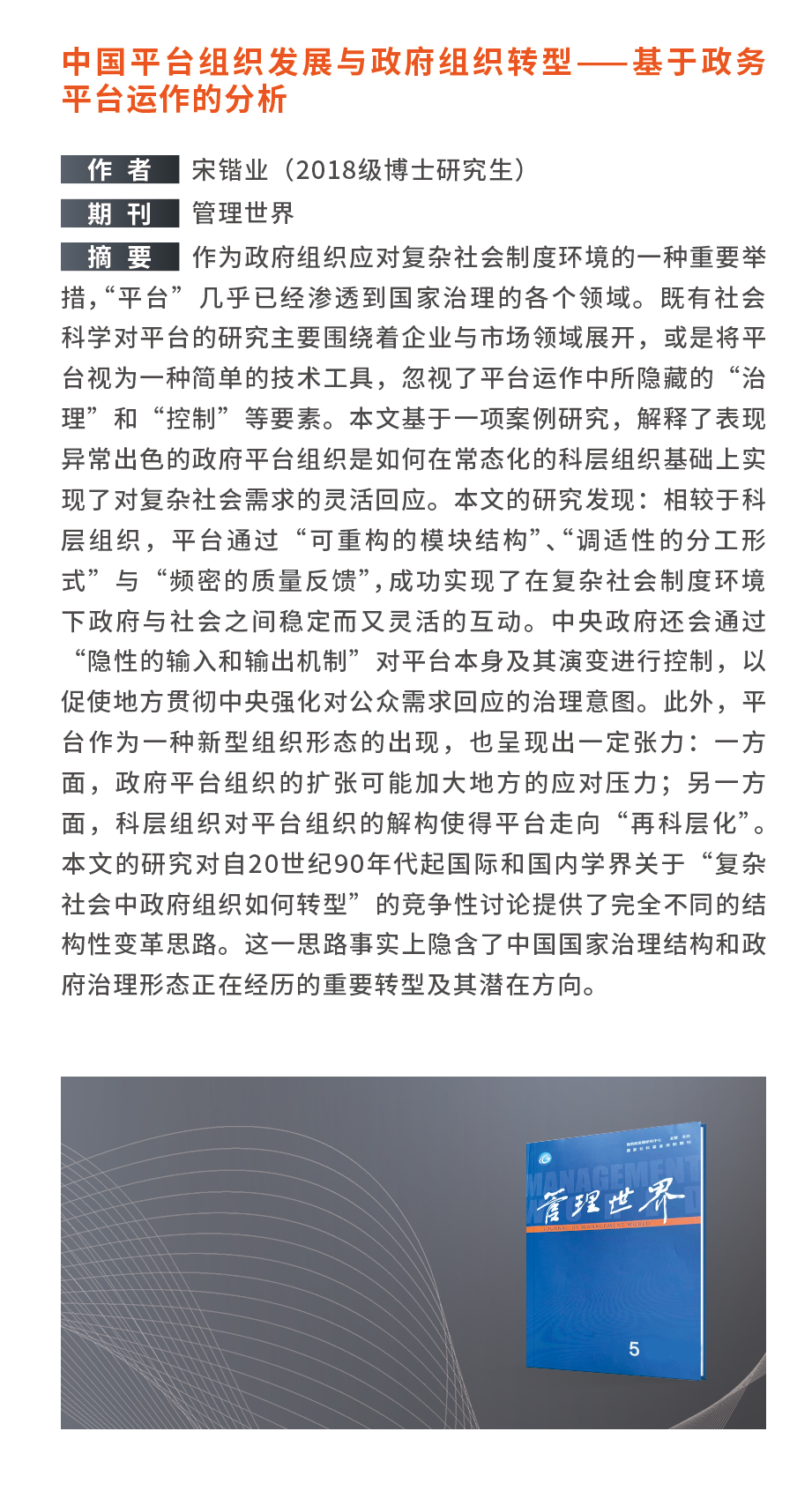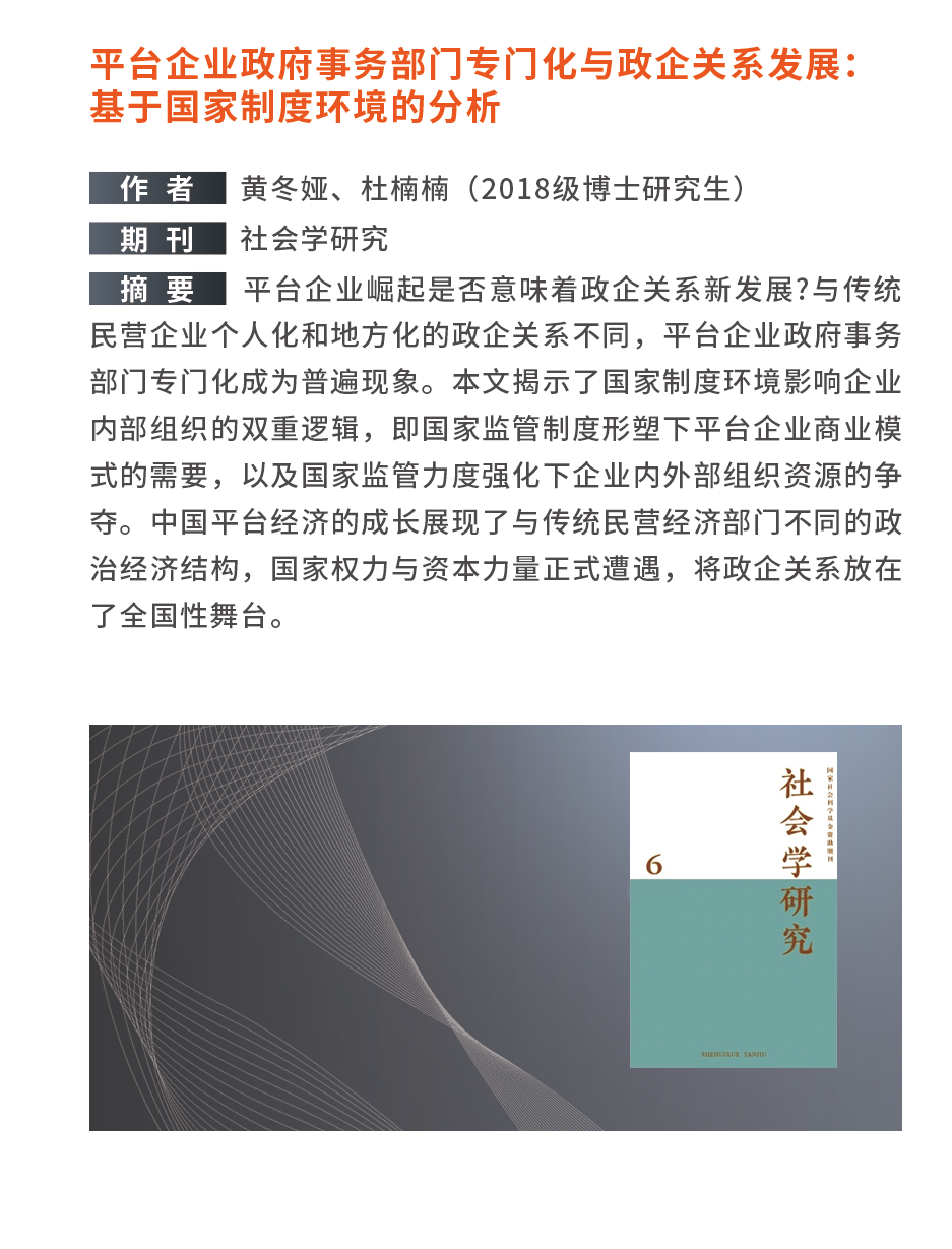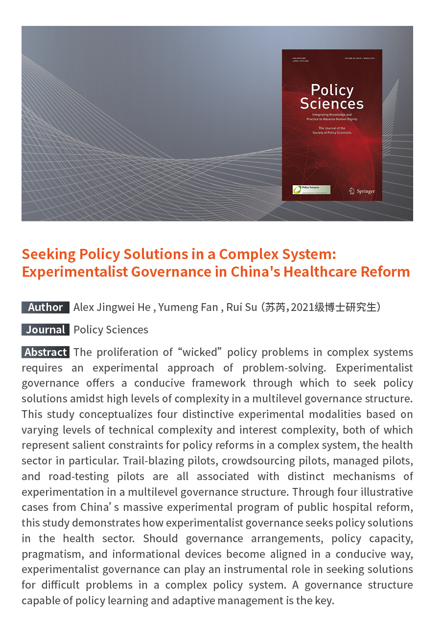 学术论文板块展示了学生作为主要作者,聚焦公共管理、政治研究等领域,在《政治学研究》《社会学研究》《管理世界》《Journal of Public Administration Research and Theory》《Policy Sciences》等国内外权威期刊上发表的高水平中英文论文。这些成果充分显示了学院学生的研究水准,体现了学院贯彻落实学校人才培养方针,聚焦新时代“中国之治”,开创实践育人新模式的成果,为一流学科建设提供有力支撑。