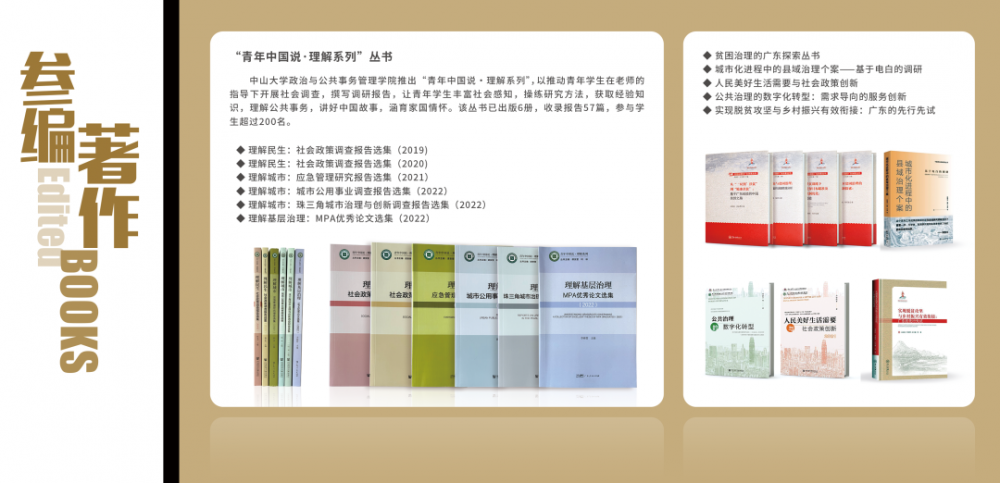 参编著作板块展示了学院学生良好的学术训练和对“中国之治”的真切理解。通过治理之学与治理实践良性互动,开展调查研究,彰显了家国情怀与社会担当。学生共参编著作15册,涵盖选举、国家治理、行政管理、社会保障、城市管理和应急管理等领域。其中,“青年中国说·理解系列”是我院青年学生在老师的指导下开展社会调查,撰写调研报告,丰富社会感知,寻觅中国式现代化道路的深刻内涵的成果。该丛书已出版6册,收录报告57篇,参与学生超过200名,体现了青年学生扎根中国治理,投身治国理政的学术抱负。