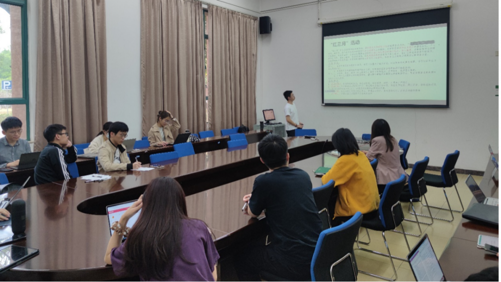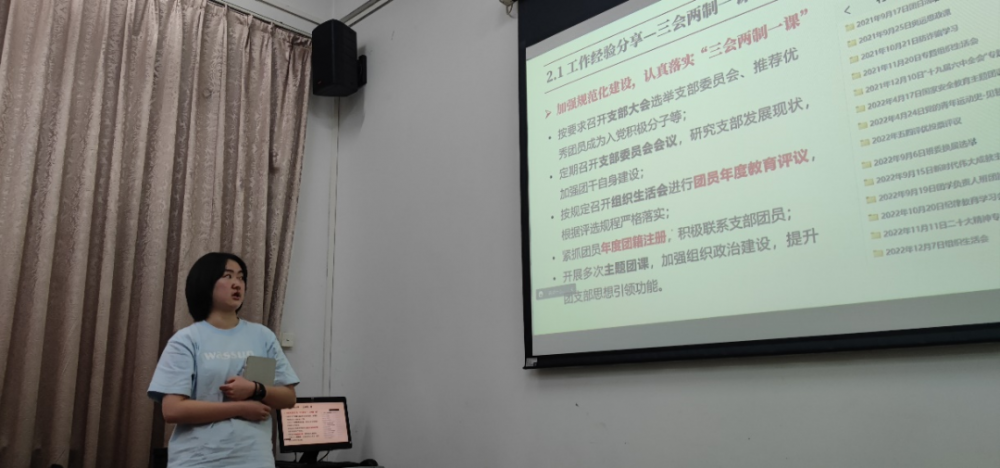 张一越同学首先介绍了团支部概况,接着从落实“三会两制一课”、督促“青年大学习”、开展“红三月”活动等三方面介绍了具体的工作方法。张一越同学结合本班实际情况,创造性地开展了“图书漂流”、“捐赠公益步数”等红色宣传活动,成功调动起青年团员的参与热情,取得了理想的成果。最后,张一越同学分享了担任团支书的心得体会,她认为“严于律己,严负其责”是团支书必备的精神品质,而“团结同学,人尽其用”是顺利推进工作的不二法门。
