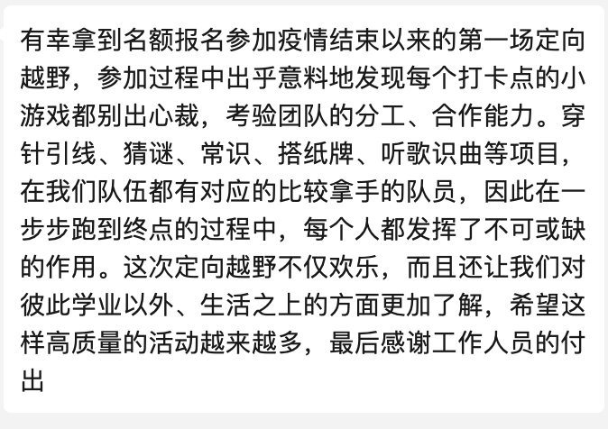 虽然本次定向越野活动已圆满结束,但火热的青春仍在延续。在微风徐徐的春天、在绿树成荫的夏天、在落叶缤纷的秋天、在银装素裹的冬天,怀抱着沉甸甸的美好回忆和对未来的热切期许,我们明年再聚!