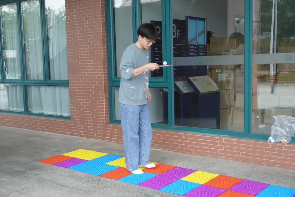 寻着虎蛟的叫声,小伙伴们向人文社科楼进发!远远便能看到地面上铺着五颜六色的指压板,那是赶在洪灾来临之前运送虎蛟卵所必经的“崎岖之路”,必须忍耐住脚下的疼痛、集中注意力。速度很重要,安全更加重要!