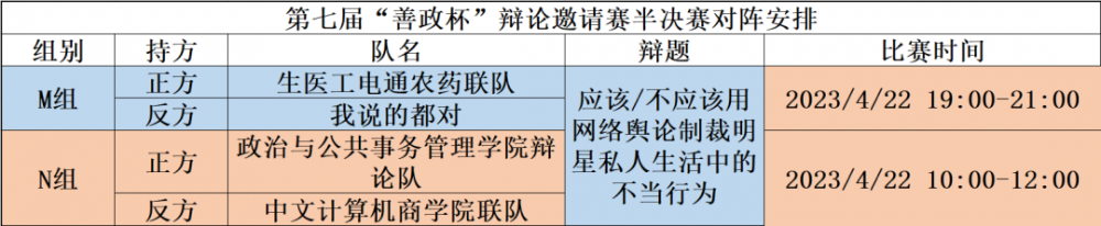 第七届“善政杯”辩论邀请赛复赛已经落下帷幕,成功晋级的四支队伍将会在本周六为大家带来精彩绝伦的半决赛,让我们拭目以待!
