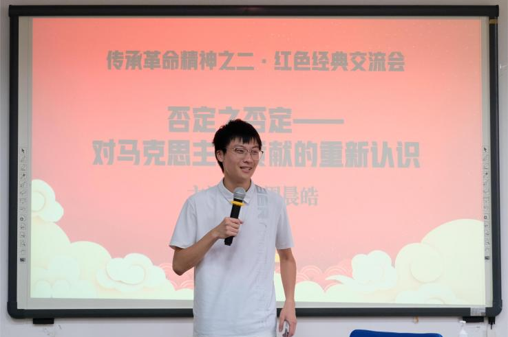 诵读会结束后,伴着会议室内热烈的氛围,周晨皓同学结合相关马克思主义经典,面向全班同学做“否定之否定——对马克思主义贡献的重新认识”主题报告。
