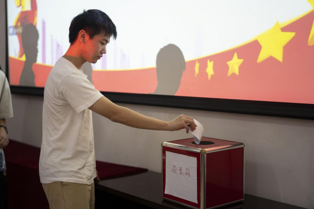 发言完毕,唱票人、监票人、计票人代表开封、检查选票。选票发放后,全体学生代表依次上台进行无记名投票。