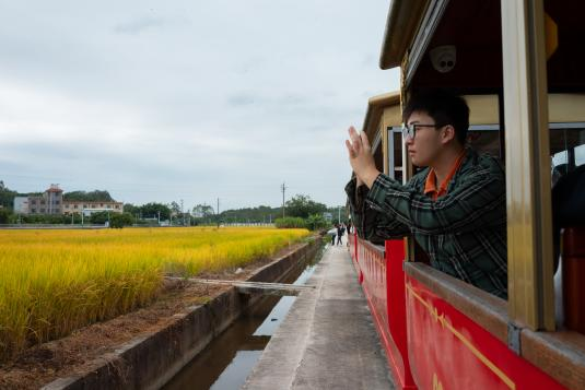 “一季清秋,一片稻田。在学院的组织下,我们来到广州市增城区正果镇岳村,在观光小火车游览新乡村风景,在稻田里体验水稻收割,听取“哇”声一片,体会粮食的来之不易。我们还游览了正果老街,感受当地特色农产品以及独具风味的濑粉。