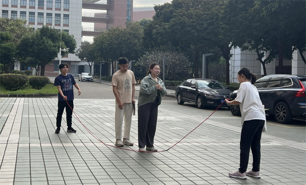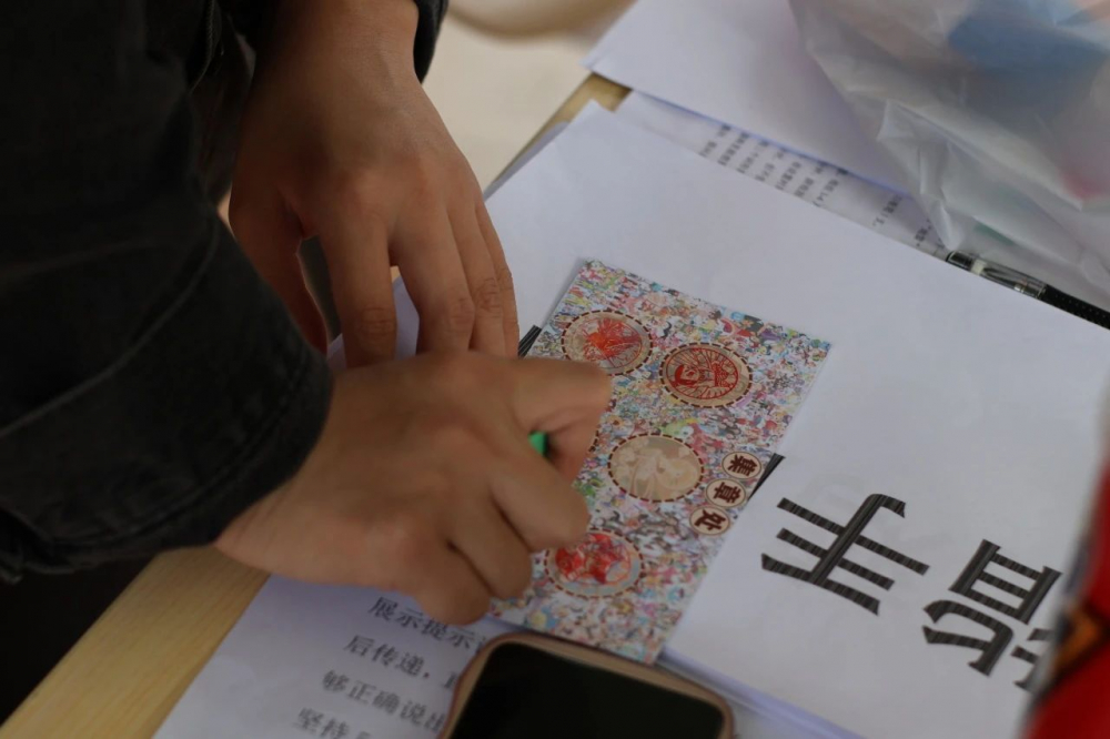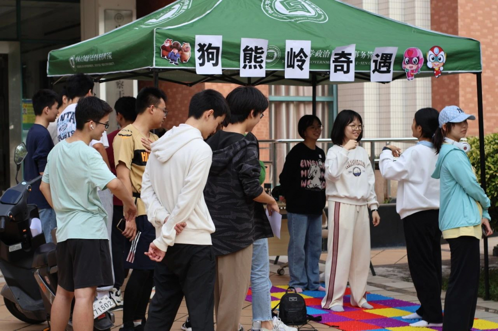 进入狗熊岭看见密布的丛林(指压板),“看来蹚过这片地方不容易呀!”在政务学院院楼门前,队员们玩起了“你划我猜”游戏。第一位队员根据工作人员给出的提示词,向后一位队员做出相应的动作,后一位队员模仿动作,直到最后一位队员猜出成语,让队友心领神会。欢声笑语中,各个队伍终于踏过了指压板,穿越了狗熊岭,走向下一关。