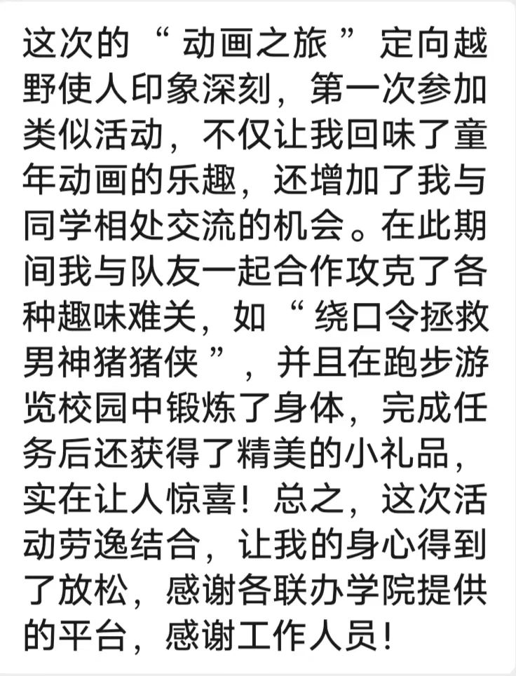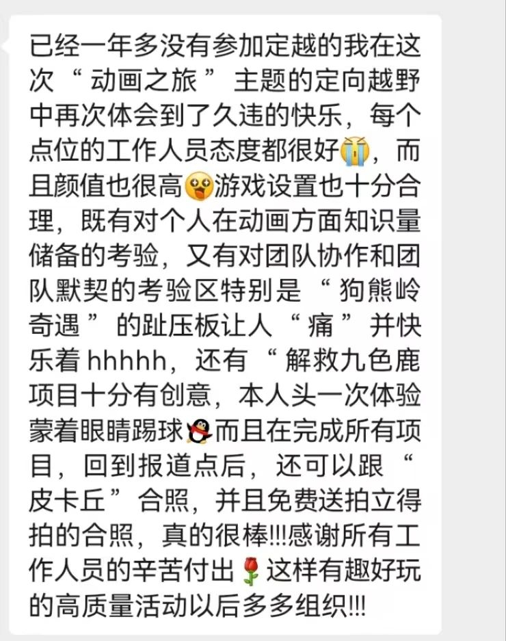 “动画之旅”定向越野不仅仅是一次活动,更是一次对我们童年时光的深情回望。它让我们在繁忙的生活中,找到了一丝与童年记忆的连接,重温那份天真无邪、无忧无虑的时光。此次定向越野活动的圆满结束,是我们对美好回忆的致敬,也是对未来道路的期许。我们希望通过这次活动,能够唤醒大家心中那份童年的梦想,让我们在追寻未来的道路上,始终保持那份纯真与热情。同时,我们也希望借此活动提醒大家,身体是革命的本钱。在追寻梦想的道路上,我们要注重身体健康,以更好的状态去迎接更美好的未来。