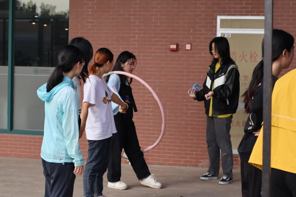 经典歌曲一响起,唤醒了每个人的童年回忆。其中,英姿飒爽的黑猫警长带领伙伴勇制反派老鼠“一只耳”的剧情更是令人印象深刻。来到人文社科楼的点位“抓捕一只耳”,队员们手拉手,齐心协力用身体来传递呼啦圈。最终身形矫健、反应灵活的队员们均成功破解层层圈套,成功抓住“一只耳”!