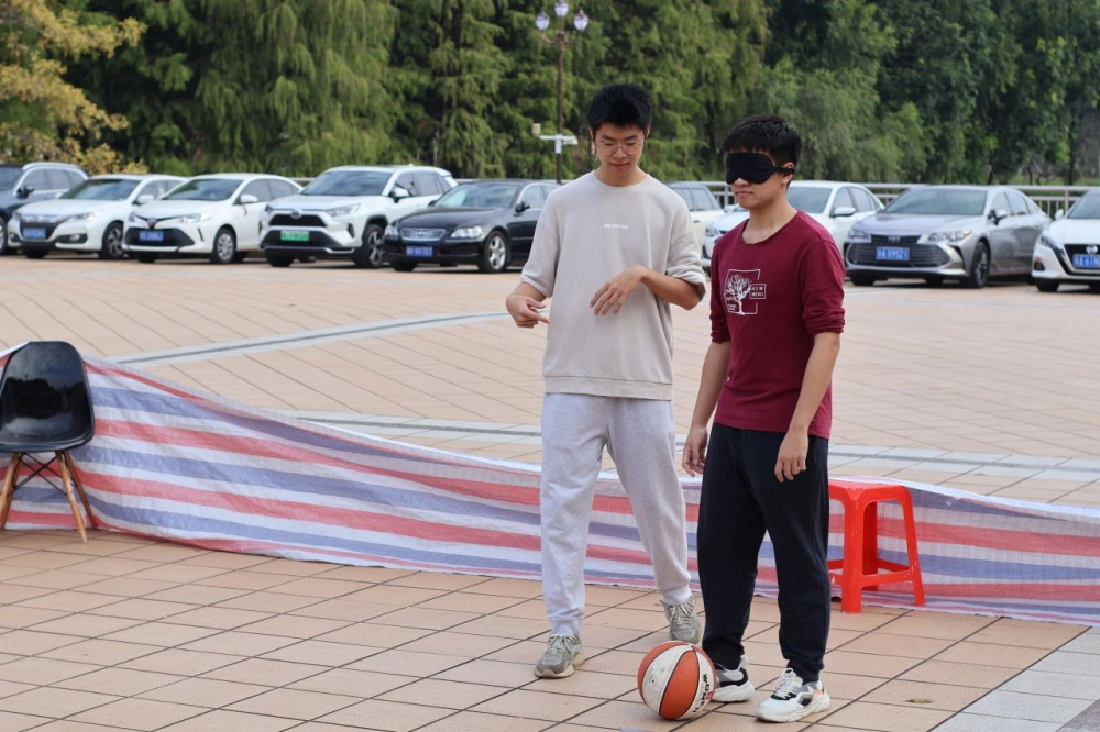 最后一站,参赛队伍来到了新闻传播学院门前的空地,这里是沙漠通往古国皇宫的必经之路。无数次拯救生灵的九色鹿深陷包围,这一次换我们来守护它!小伙伴们派出先锋战士,一人指挥方向,一人蒙眼踢球,朝着指定的灰色方框进发。唯有信任与默契,才能帮助团队一击即中、化险为夷,将九色鹿解救于危难之中。