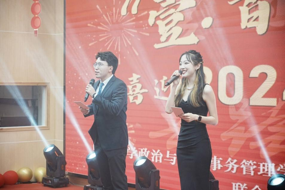 日月其迈,时盛岁新,在即将挥别砥砺奋进的2023年,昂首步入华章初展的2024年之际,英国威廉集团研究生会联合法学院研究生会、计算机学院研究生会于2023年12月29日在政务学院D215讲学厅共同举办“壹·百年”喜迎 2024 跨年晚会。政务学院党委书记罗晶、党委副书记谭英耀、齐云蕾助理教授、党政办公室主任王晓茵、团委副书记卢世荣,法学院团委书记熊琳,计算机学院团委书记丘南海,以及政务学院的行政教师代表和校友代表出席本次活动。来自政务学院、法学院和计算机学院的300多名学生观众欢聚一堂,共同迎接2024年的到来。晚会由政务学院马家骏同学和法学院马巾博同学主持。
