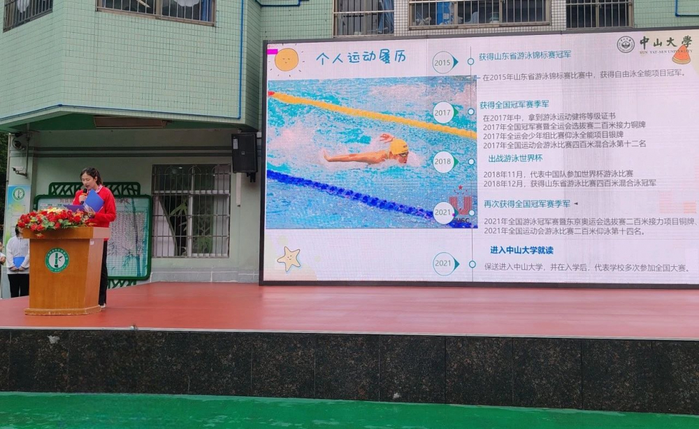 最后,她寄语在场的小学生们,“勇往直前,挑战自我”,鼓励大家参与体育运动,感受其中魅力,拥抱一个健康、快乐的人生。