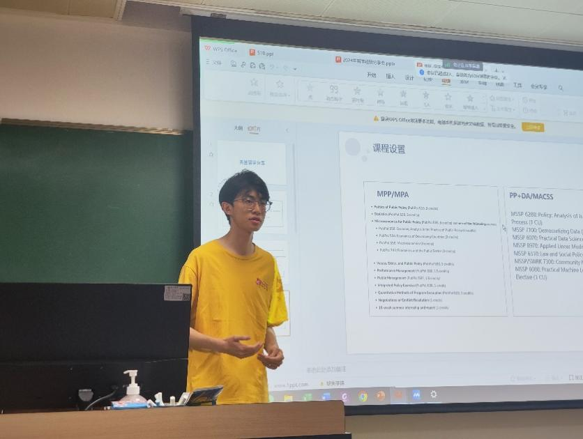 第一位分享的是2020级政行专业的郭润语同学。郭润语同学申请了宾夕法尼亚大学社会政策与数据分析、密歇根大学公共政策、卡内基梅隆大学公共政策管理数据分析等专业,并最终选择了宾夕法尼亚大学社会政策与数据分析专业,对留美流程有丰富的经验。郭润语同学为同学们介绍了美国研究生定量社科专业,从所选择的两个专业出发分析了有关专业未来的就业方向,他还进一步分享了MPP和MACSS的课程内容和区别。对于有留美需求的同学,郭润语同学强调了留美择校的策略方法和原则,为同学们细心梳理了留学的申请要求、时间线和准备材料。
