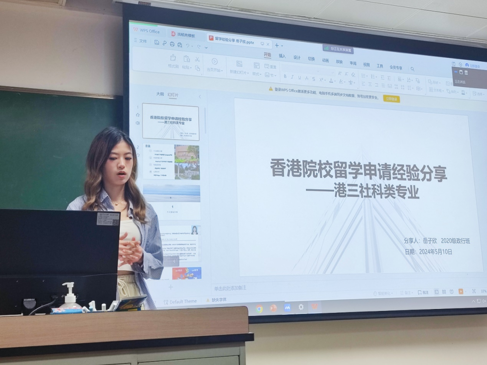 第二位分享的是2020级政行专业的岳子欣同学。岳子欣同学申请了香港大学公共行政非营利管理、中国发展研究专业,港中文公共政策、社会政策专业以及港科技社会科学专业,并最终选择了香港大学非营利管理专业。在分享会上,岳子欣同学首先介绍了她的个人情况,为同学们讲解了出国留学和国内读研的区别,还以自身经历为基础分析了六个香港的大学与专业申请的要求。作为颇具经验的港校申请者,她认真为同学们介绍了香港的大学申请流程,分享了笔试面试过程中的经验和申请留学过程中的心得体会。
