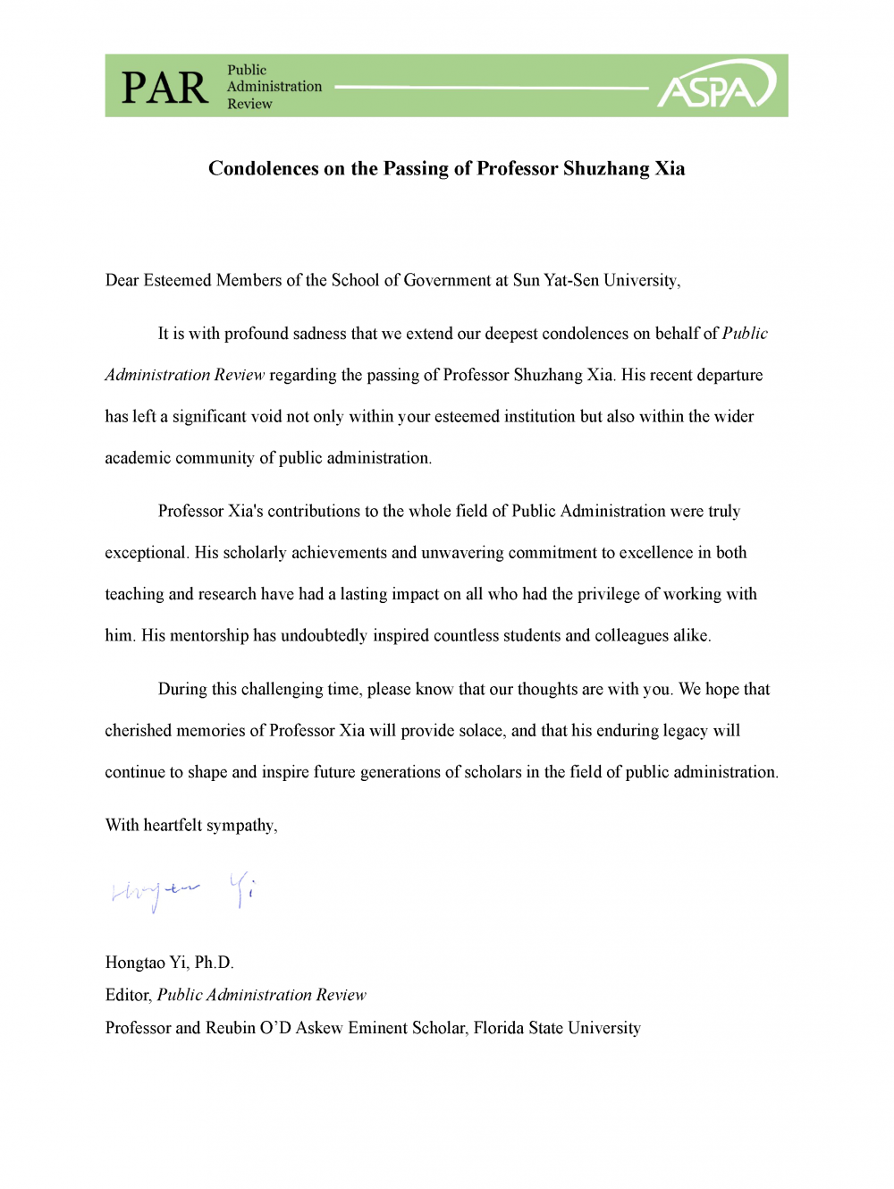 Public Administration Review 唁电