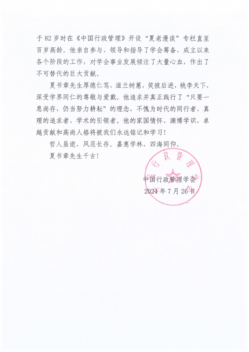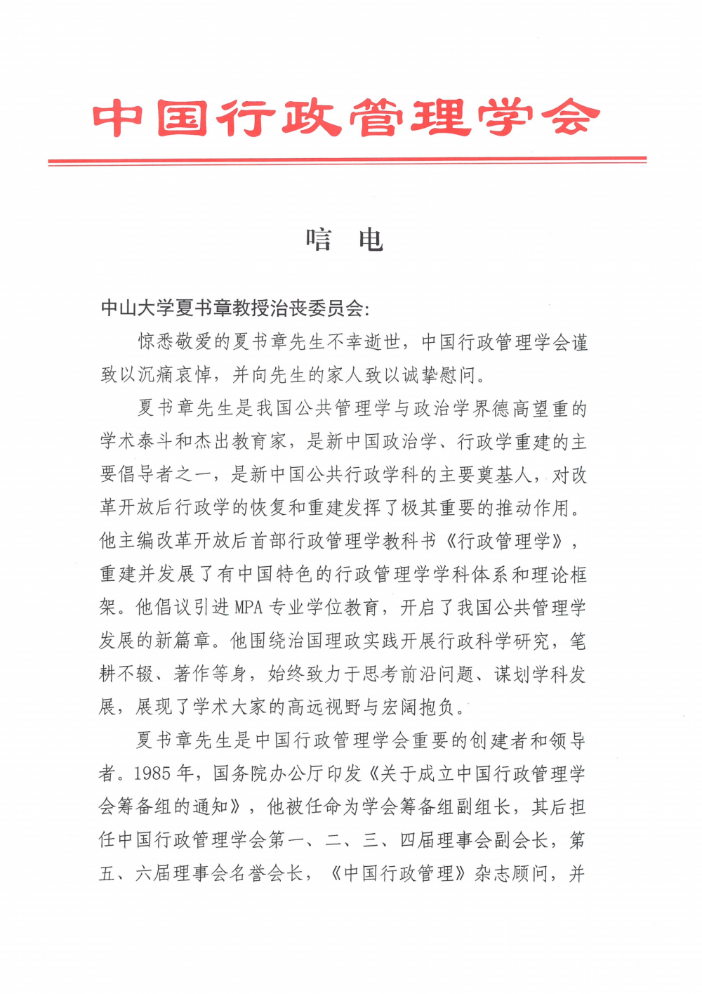 中国行政管理学会唁电