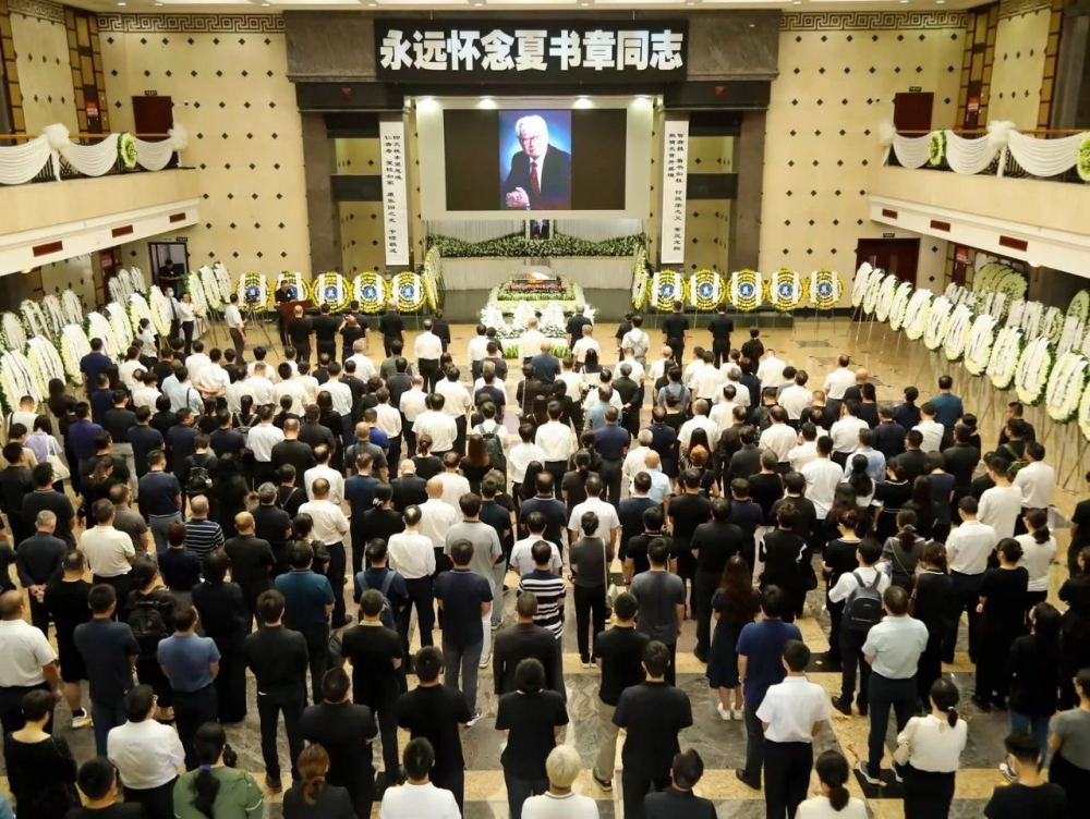 在深沉悠扬的钢琴曲《我的祖国》中,与会人员追忆夏老波澜壮阔的一生,逐一瞻仰夏书章同志遗容作最后告别,并对家属表达深切慰问。