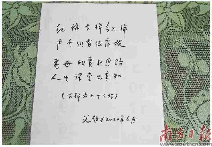 她还珍藏着一张旧日历纸,背面是父亲写给她70岁生日的贺诗:“纪梅古稀今不稀,严冬仍有傲霜枝。”每当孩子们的“逢十”生日,夏书章都会为他们写一首诗——这,是他独有的浪漫。