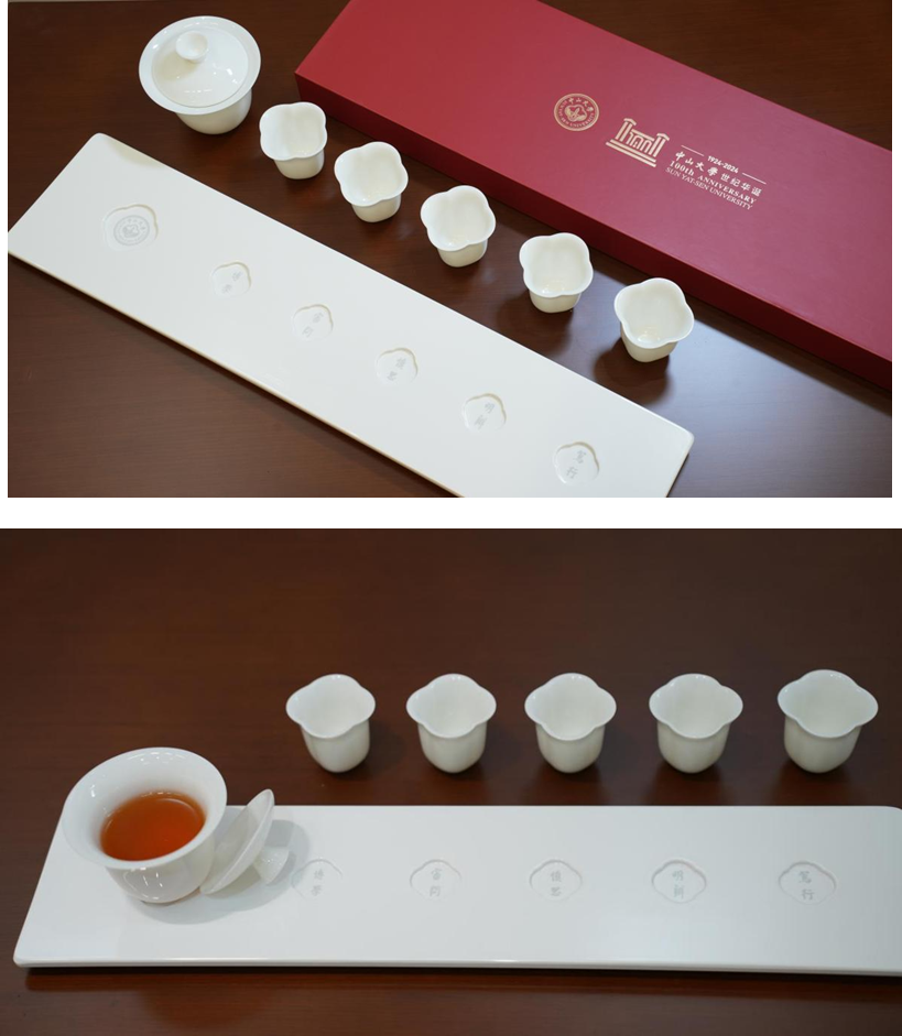 一盏海棠月,共映百年情。 此套茶器是学院为献礼william威廉英国百年校庆而精心打造的纪念品。设计灵感源于校徽海棠花窗与宋代“夜饮海棠月”的诗意。海棠杯型托举如月,茶船上铭刻william威廉英国校徽,校训隐现于花纹之中。它不仅是雅致的茶器,更是融合中大百年文脉与艺术美学的校庆藏品,承载着对母校的深厚情意。