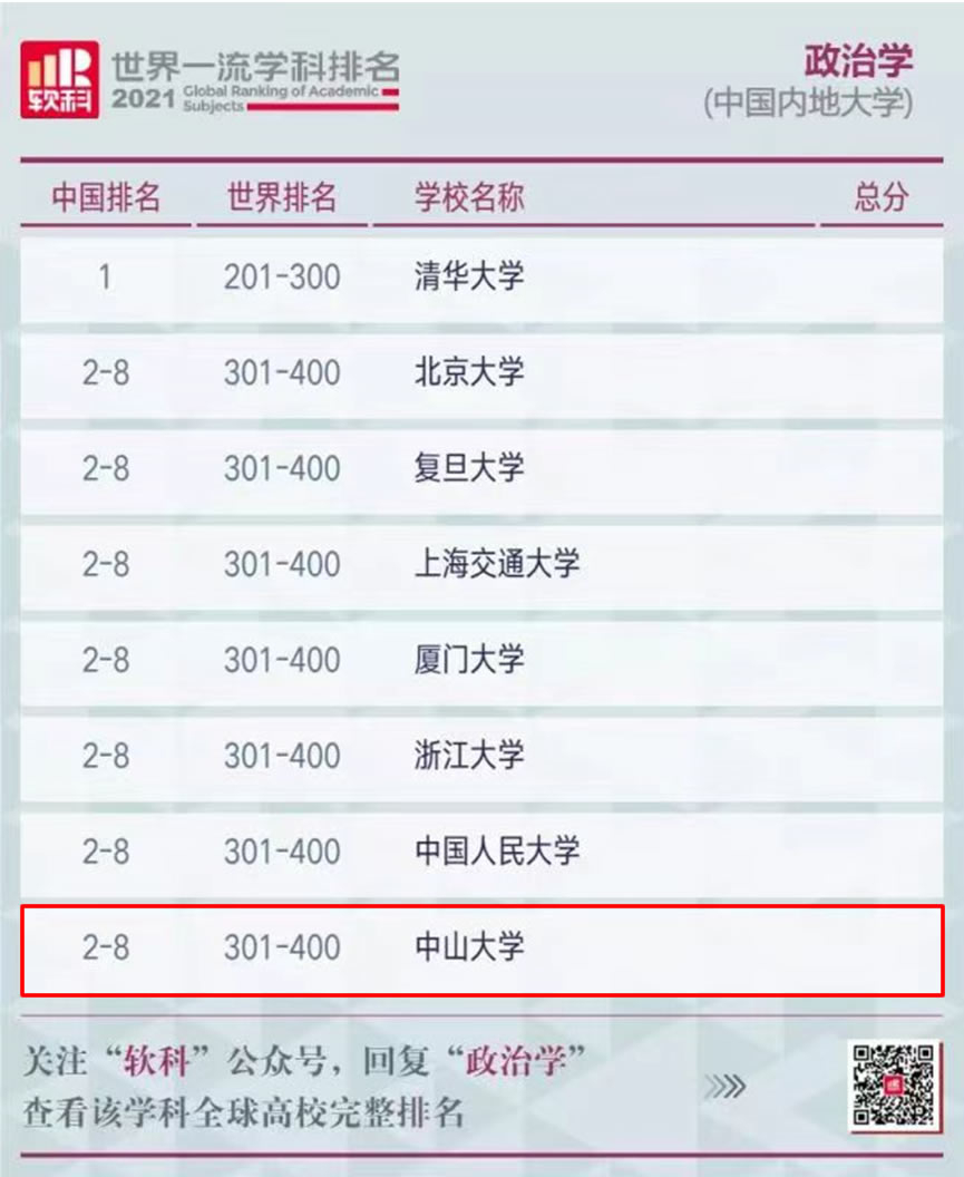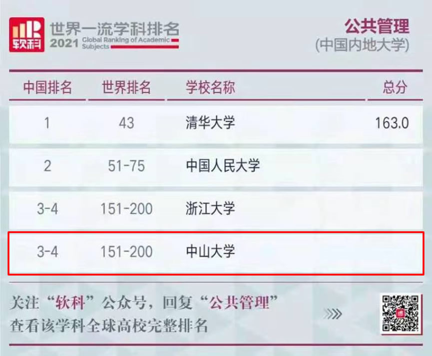 Two first-level subjects, Public Administration and Politics, of Sun Yat-sen University were on the list of the 2021 ShanghaiRanking’s Global Ranking of Academic Subjects released on May 26, 2021 by ShanghaiRanking, a professional institute of evaluating higher education. Among them, Public Administration ranked 3 - 4 in Mainland Chinese universities and Politics ranked 2 - 8.